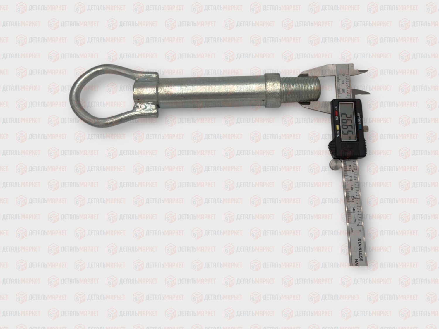 Диаметр резьбы 27 мм, шаг резьбы 1,5 мм, длина крюка 255 мм, длина резьбы 40 мм.